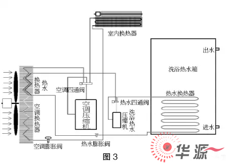 熱泵三聯(lián)供系統(tǒng),概念新穎,所謂空調(diào)模式運(yùn)行時可以免費(fèi)加熱洗浴熱水,購買一套三聯(lián)供設(shè)備,可以實(shí)現(xiàn)室內(nèi)制冷、供暖及洗浴熱水。可以降低部分初投資,但運(yùn)行費(fèi)用與空調(diào)加空氣源熱泵熱水機(jī)的運(yùn)行費(fèi)用是相同的。如下圖2所示: